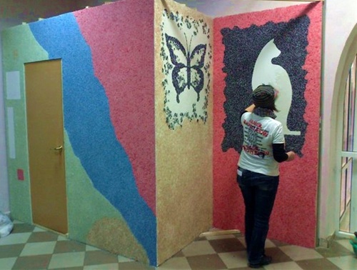 В смесь можно добавлять некоторые виды красок, тем самым добившись неповторимой цветовой гаммы. При необходимости она наносится на поверхность в виде любых изображений или аппликаций, комбинируется с другими видами стройматериалов. Жидкие обои могут использоваться в обычном интерьере, сделав его уникальным. Варианты применения жидких обоев